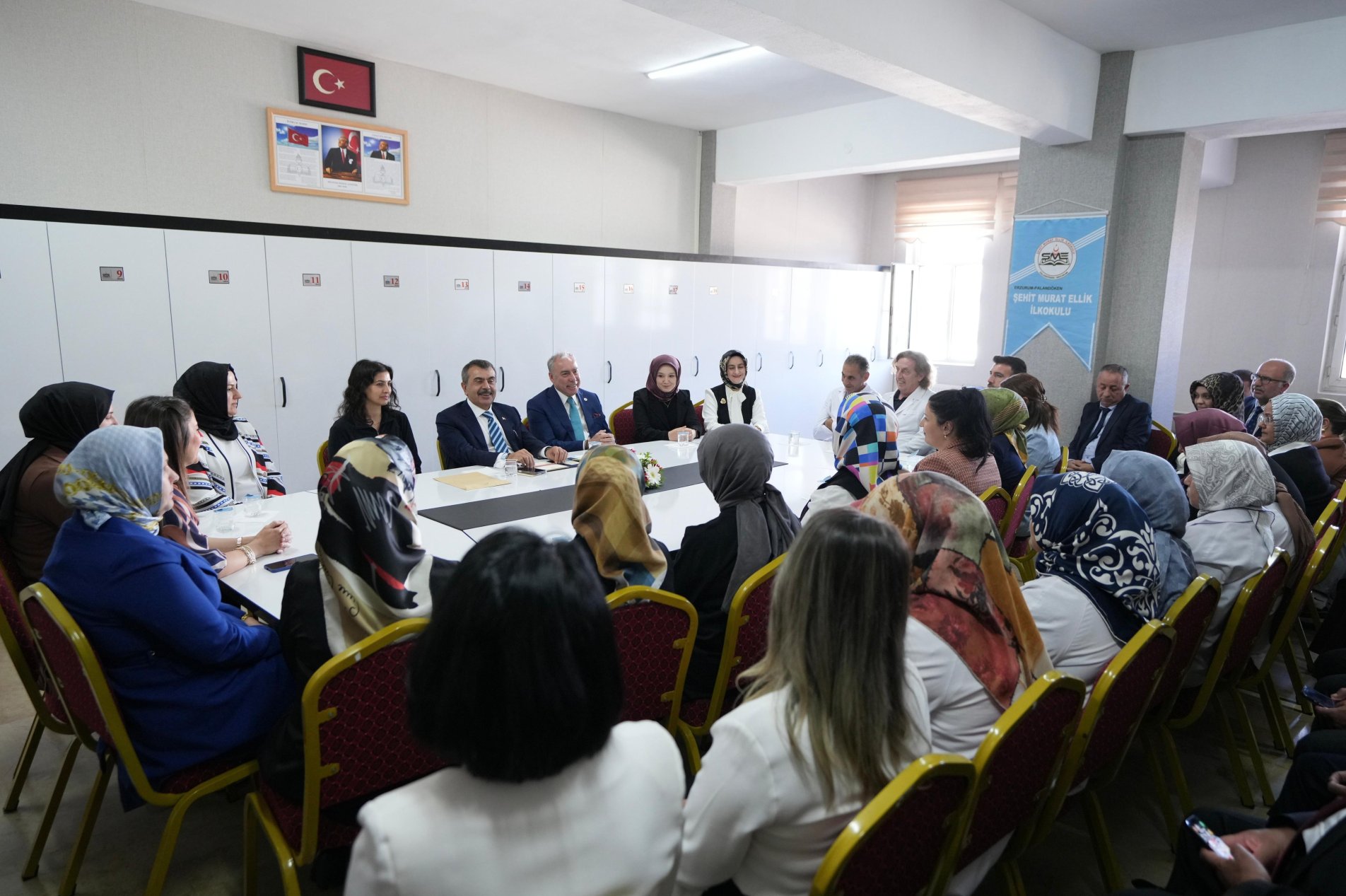 Bakan Tekin, yeni eğitim müfredatıyla ilgili bilgiler verdikten sonra öğretmenler odasında öğretmenlerle toplantı yaptı.